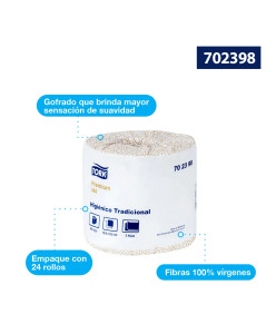 El papel Higiénico Tradicional Premium de 360 hojas dobles de Tork® tiene el cantidad y la calidad adecuada para maximizar el rendimiento y minimizar el desperdicio.